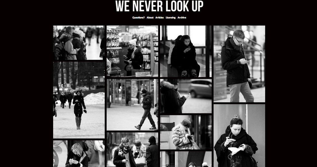 Su Mashable leggo di questo blog fotografico “We never look up”che raccoglie foto di persone colte di nascosto, per strada, con lo sguardo rivolto in basso verso lo schermo del proprio telefono.
