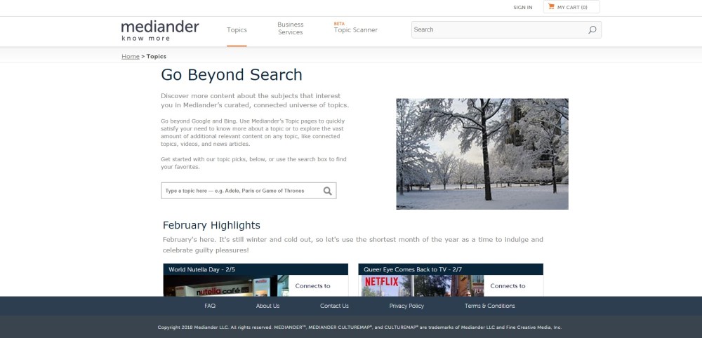 Mediander è un sito di informazione culturale che trascende la forma del semplice sito web ma assomiglia più ad un content aggregator (aggregatore di contenuti), con la sostanziale (e benaugurata) caratteristica che i contenuti sono (ancora) totalmente gratuiti. L’avrete immaginato ma Mediander è in lingua inglese per cui sia l’argomento che vorrete cercare va digitato in inglese nella barra di ricerca, sia i risultati che vi verranno restituiti sono in lingua inglese. Oltre ad essere un content aggregator Mediander aggiunge un valore di contenuto, quello delle sue mappe culturali (cultural maps) vera e propria droga a cui mi sono votata ed assuefatta già da qualche anno.